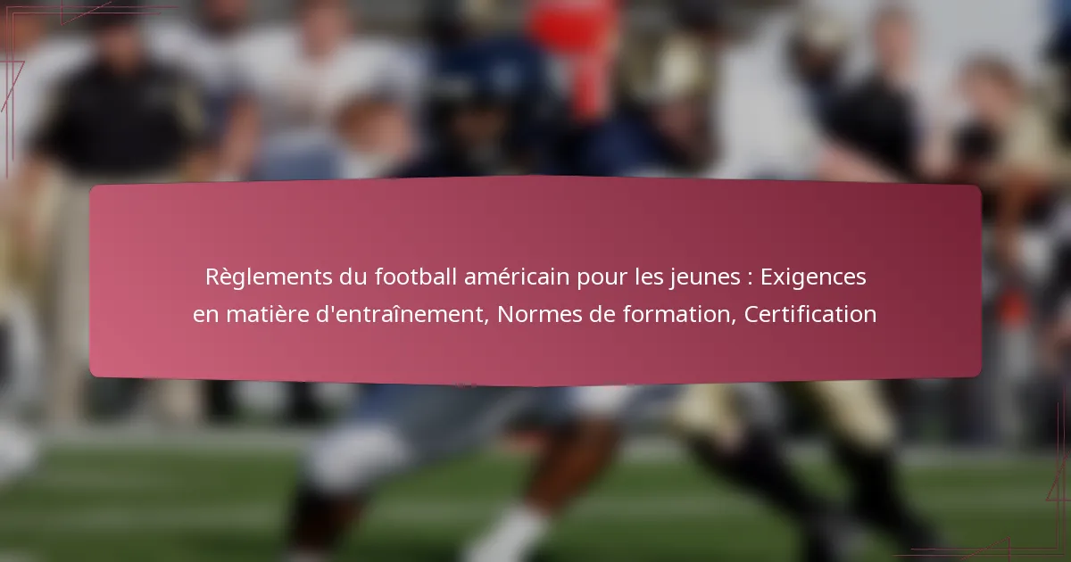 Les règlements du football jeunesse américain établissent des exigences essentielles en matière d’entraînement, des normes de formation et des processus de certification pour garantir la sécurité et le développement des jeunes athlètes. Les entraîneurs doivent répondre à des qualifications spécifiques, subir des vérifications des antécédents et suivre des cours de certification pour être bien préparés à leurs rôles. Les normes de formation se concentrent sur des pratiques sûres, la prévention des blessures et des techniques adaptées à l’âge, créant ainsi un environnement de soutien pour les joueurs. Ces mesures visent collectivement à améliorer la qualité de l’entraînement et l’expérience globale du football jeunesse.